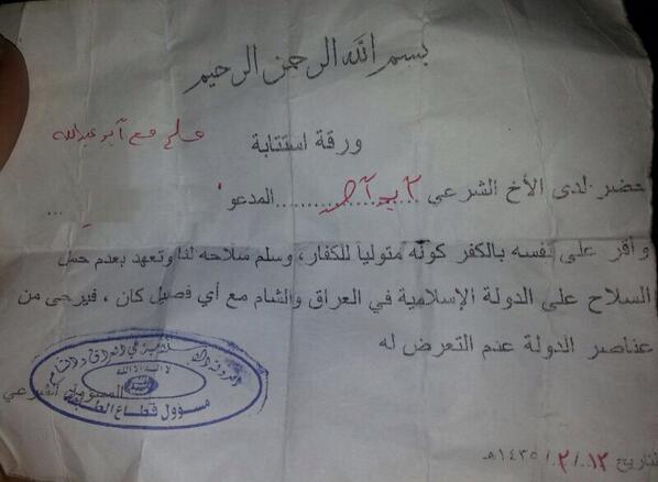 A letter of cease fire agreement between ISIS and FSA Suqur al -Sham, after attacking ISIS then surrounded by ISIS