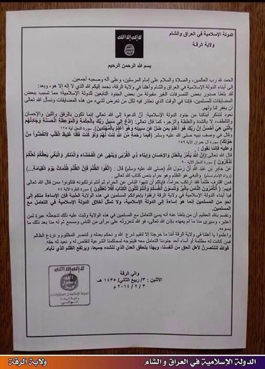 ISIS clear statement in Raqqa vows to punish any ISIS member who misbehave against civilians